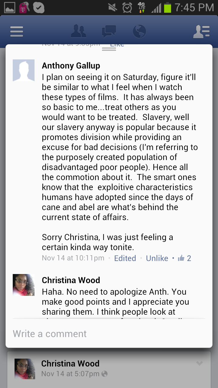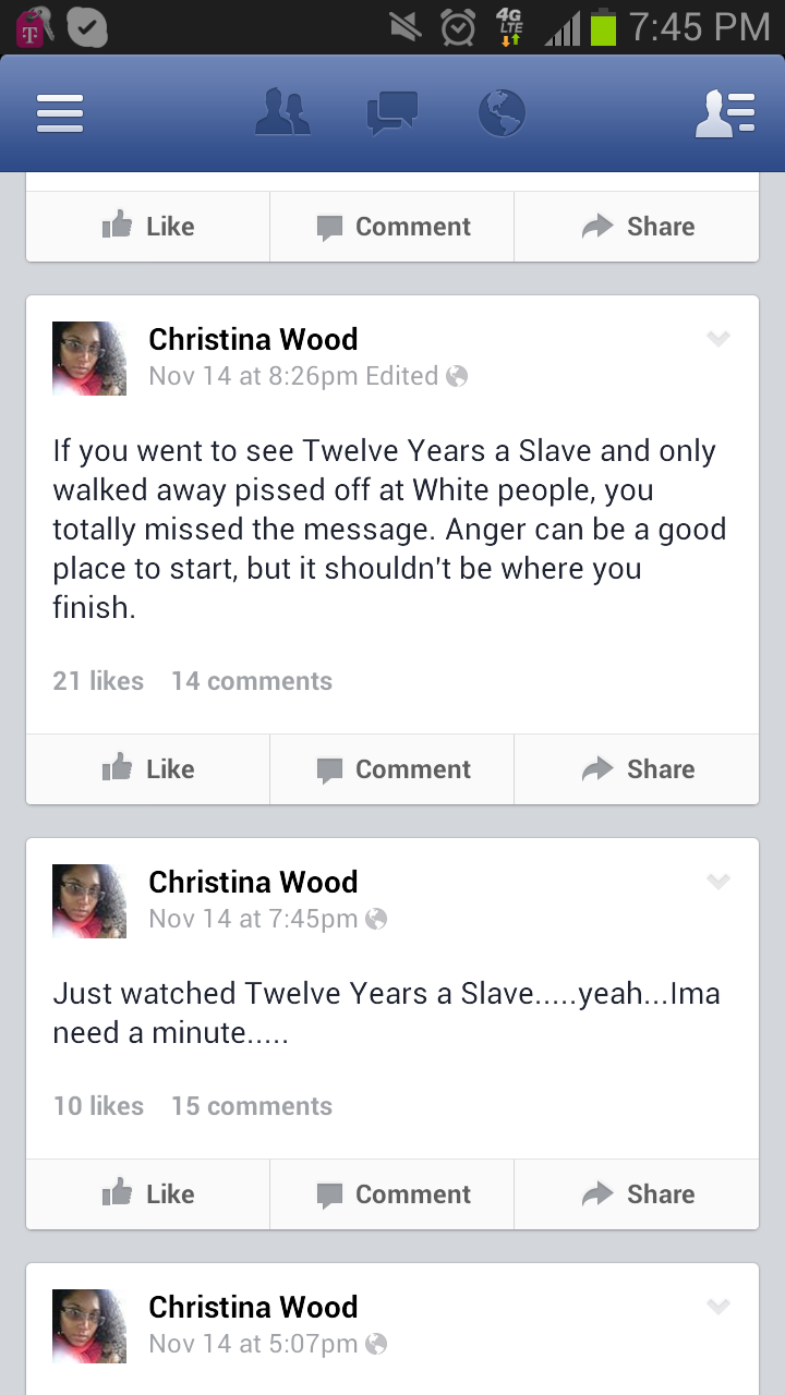 Like many other Americans, I sat in a dark movie theater and participated in the cinematic experience known as 12 Years a Slave. And of course, like many others who had watched the movie and immediately taken to social media channels, I posted my initial thoughts on Facebook about the movie upon exiting the theater.  As you can see from my screenshot below, I wasn’t exactly loquacious in my initial statements because I think I was still trying to process all that I had seen.