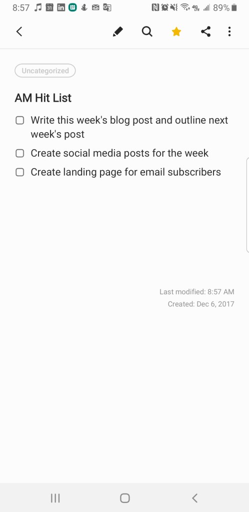 I’ve learned that if I don’t feel like there’s any compelling reason to get up early, I likely won’t do it. So I basically have to create my task list the night before and make it time sensitive so that my brain reads it as urgent. Last night I prepped my hit list and I also added the tasks to my calendar for the morning.